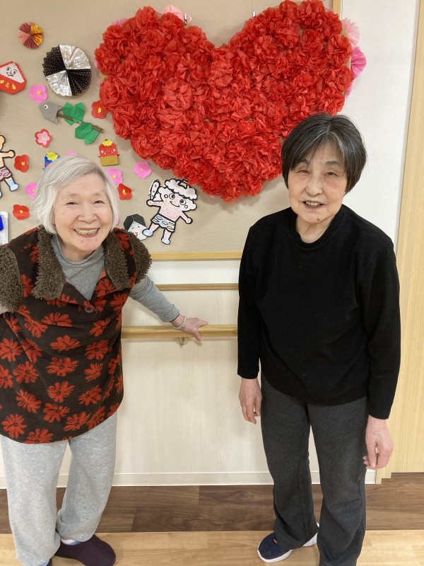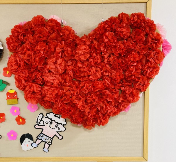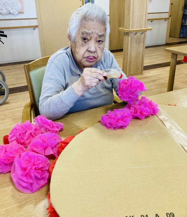 2Uの皆さんが作っていたハート、今年は赤とピンクの花をたくさん作って両面ハートの飾りにしてみました♡