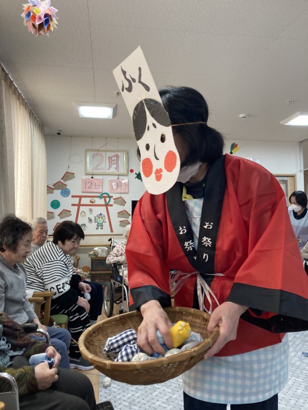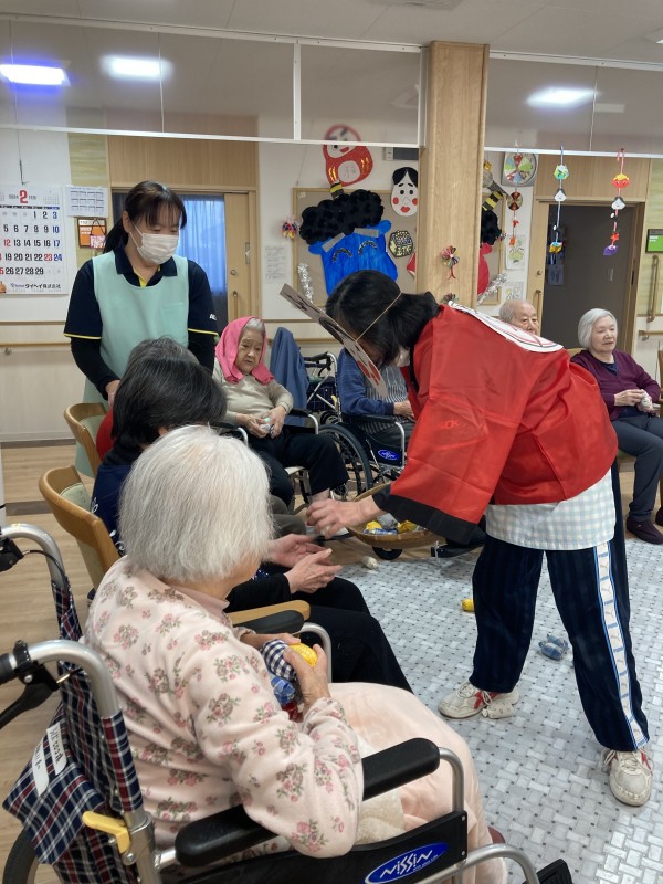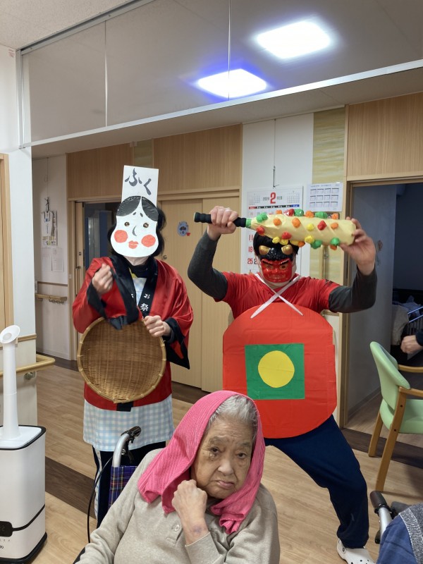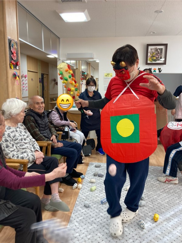 鬼退治!職員が鬼とお福さんに扮してご利用者様が布のボールを鬼に当てる「的当てゲーム」頑張って当てましょう♡