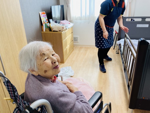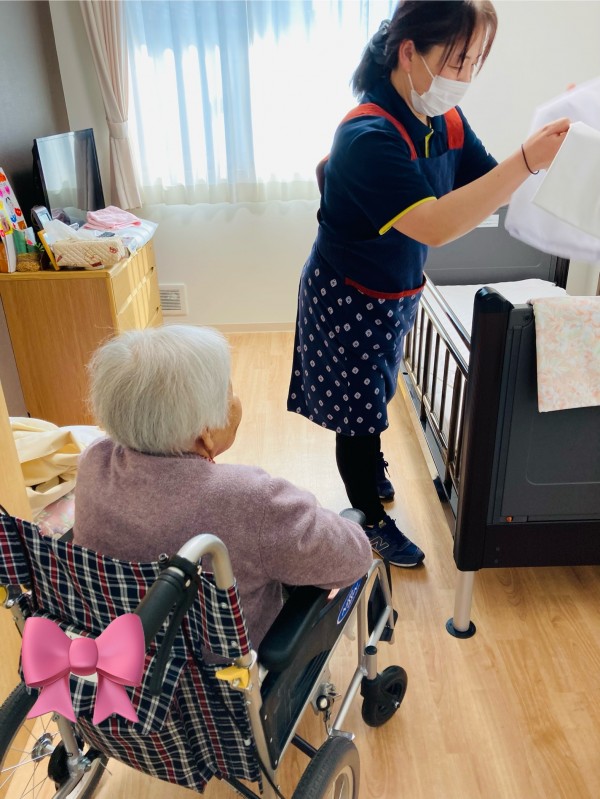 シーツ交換をしている職員にお礼を言いにお部屋へ♪