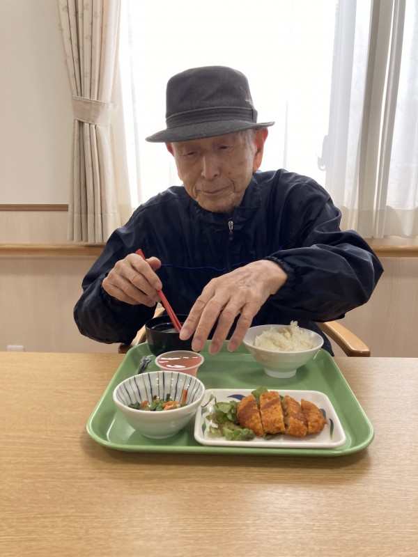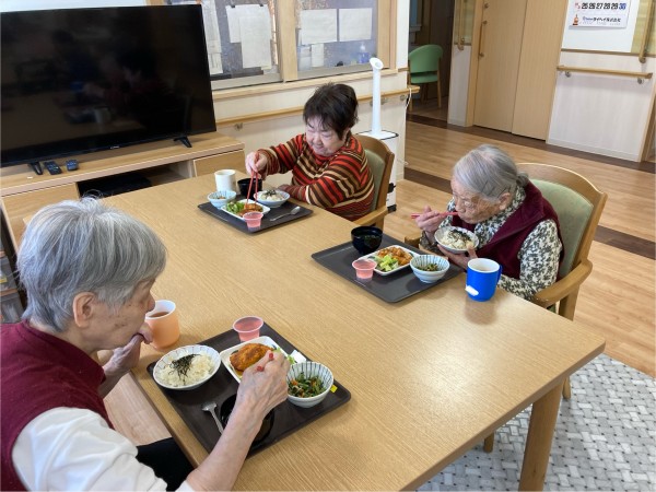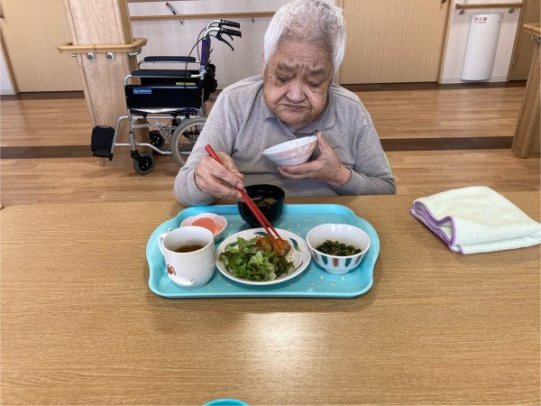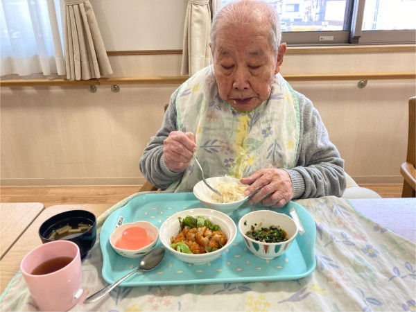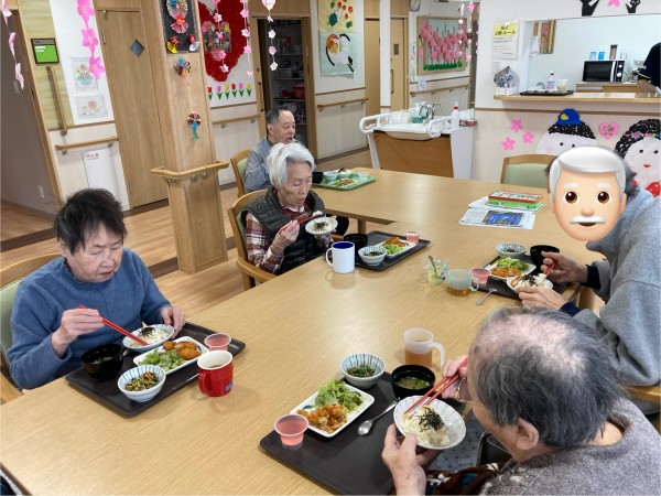 今日の昼食メニューは①筍ごはん②お味噌汁③牛肉コロッケ④菜の花ちらし⑤さくらゼリーです♪ご利用者様の「筍ごはん?」「今日は何の日?」など、話が弾む中あっという間に完食でした♡写真が間に合って良かった〜♪