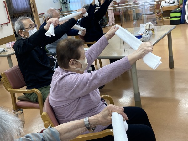 タオル体操は身体を解したり、筋肉を伸ばしたりして多くの刺激を与えていく、人気運動教室の一つとなります(*^^)v