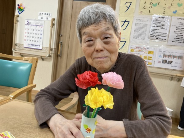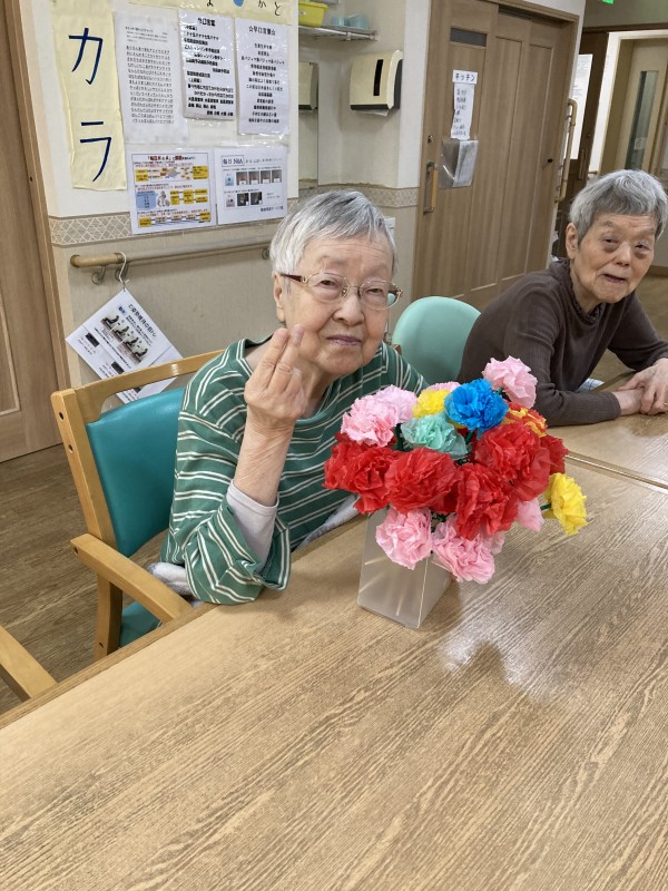 色とりどりの手作りカーネーションと一緒に記念撮影しました。