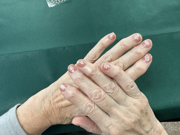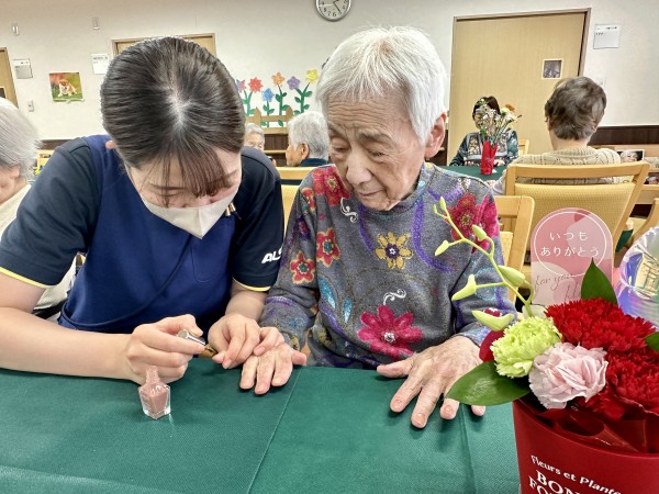 最近、東本郷ではネイルのレクを行うことがありますが、母の日は、更に皆様に綺麗になっていただこうと、ネイルシールをご用意しネイルアートで楽しんでいただくことにしました( `ー´)ノ