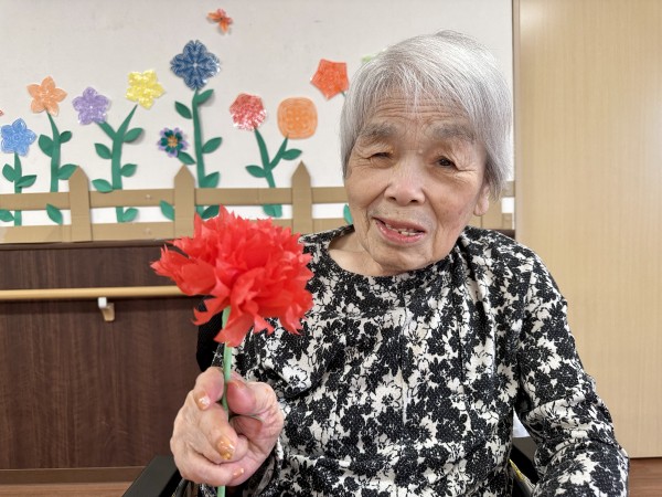 母の日でご利用者様に届きましたお花はご本人様にお届けし、更に皆様にも見ていただけるようお借りし、卓上に飾らせていただきました。