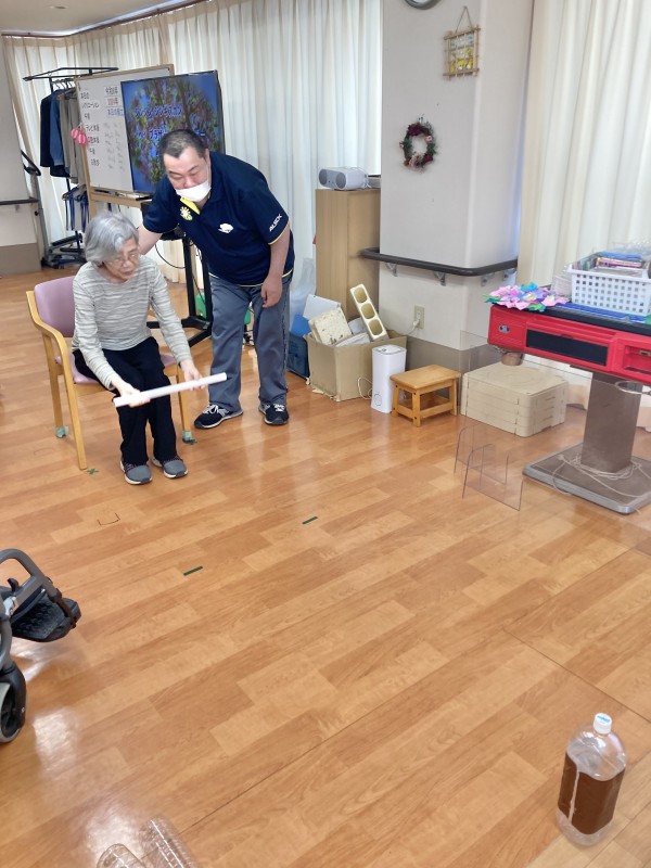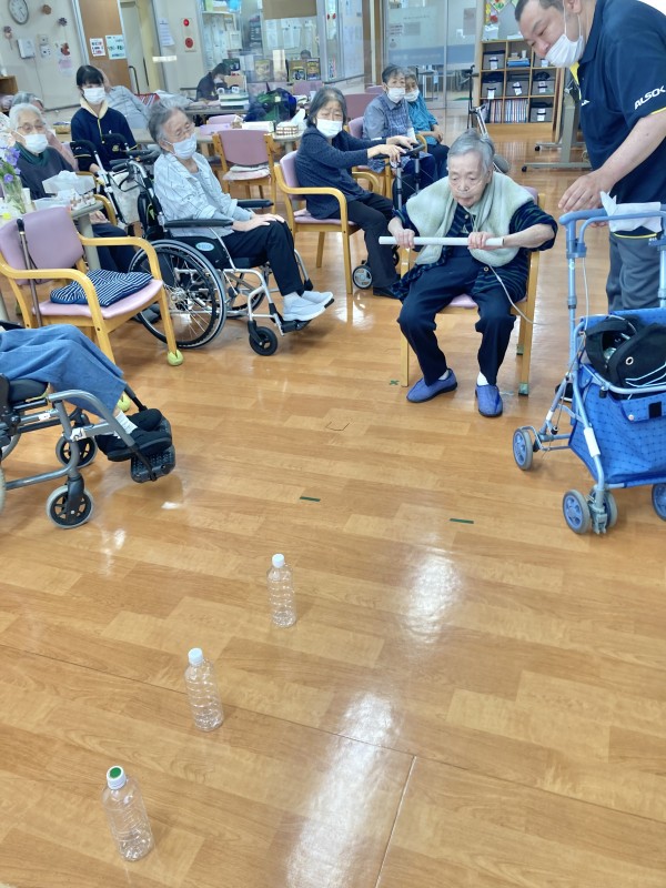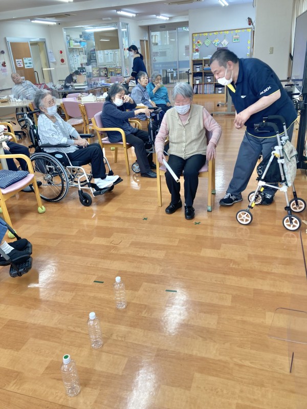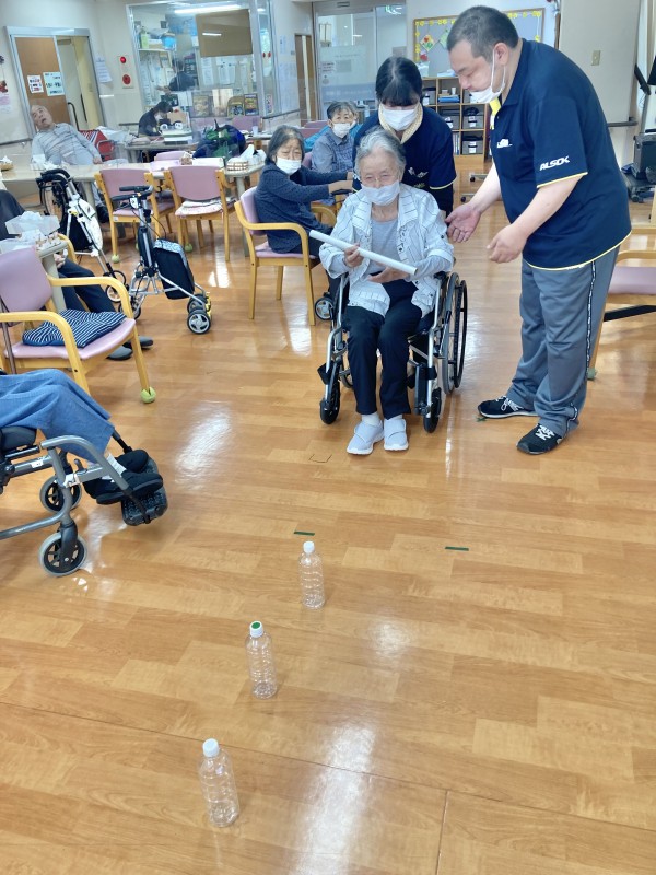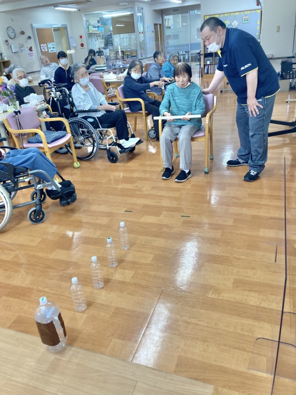 縦にペットボトルを5本並べて置いて、1人2回サランラップの棒を転がします。