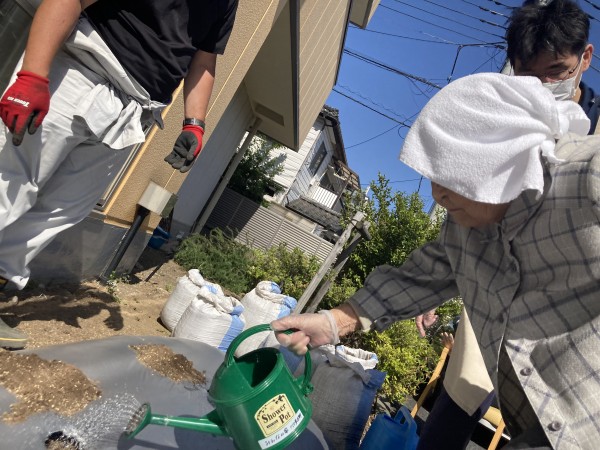 土嚢袋に土を入れておいたものを先生(いつも畑を監修してくださっているマッサージの渡辺先生です)
