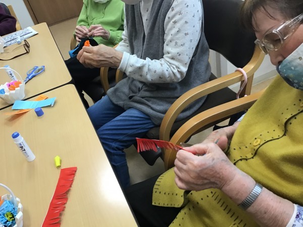 二分の一に切った折り紙をのりで折り合わせて、それを細かくハサミで切っていただきます。