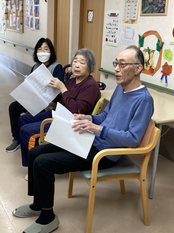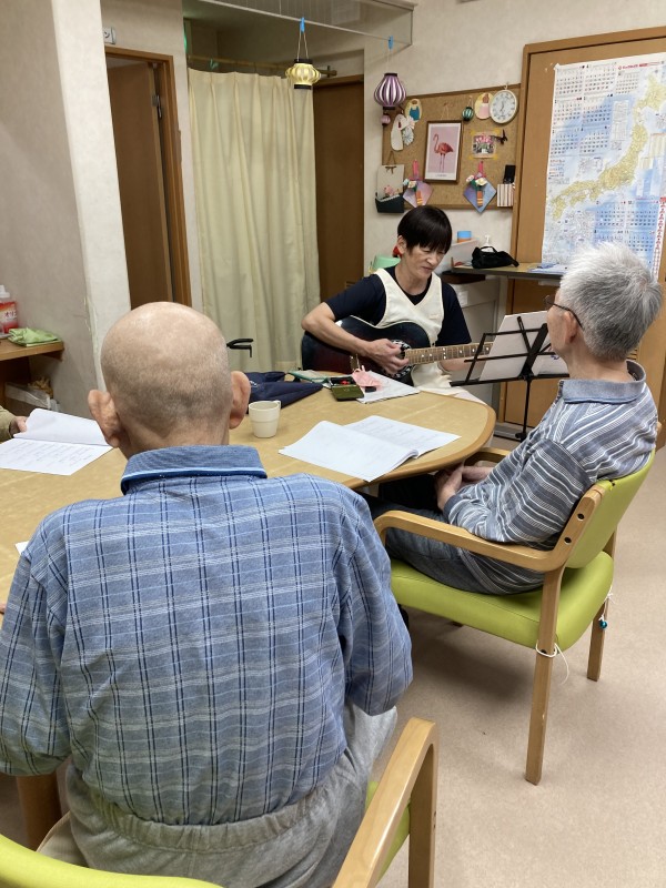 本日は、お昼の時間に職員のギター演奏で、2階・3階の利用者様と合同で合唱しました( ^)o(^ )