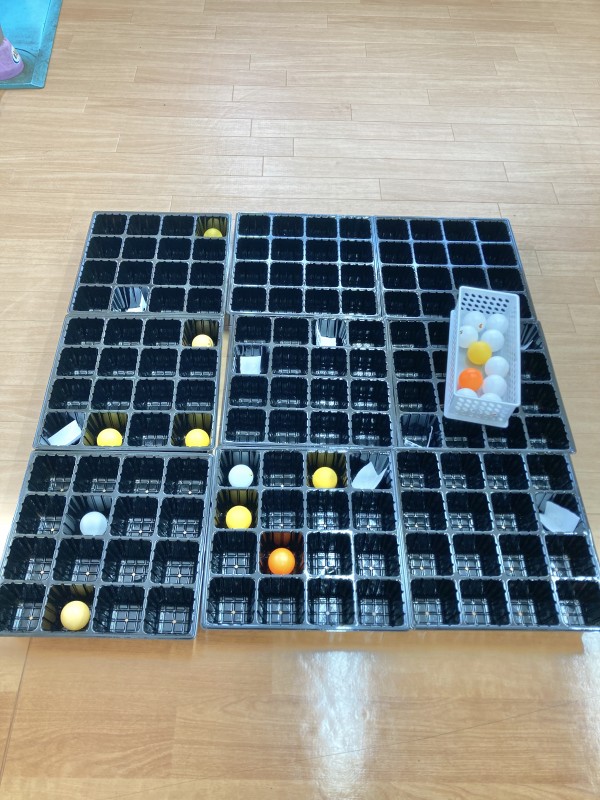 ピンポン玉を白10球、オレンジ10球を投げます。