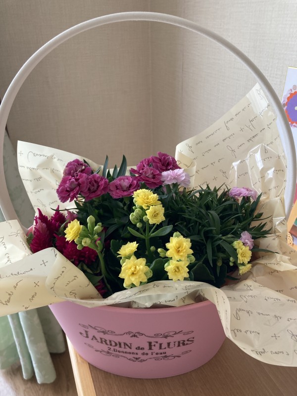 カーネーションの寄せ鉢は娘様よりプレゼントされたものです。お部屋がぱあっと明るくなりました!