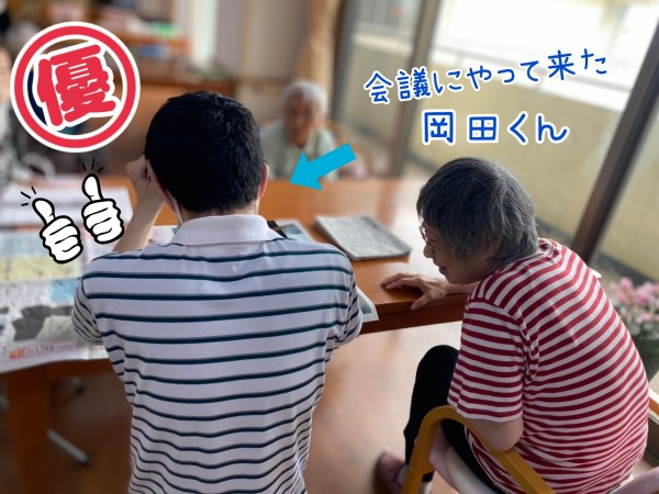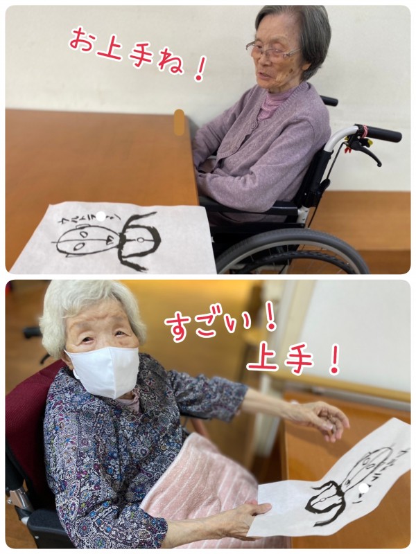 入居者様と一緒に書道かと思いきや、岡田くんの特技は絵画です!