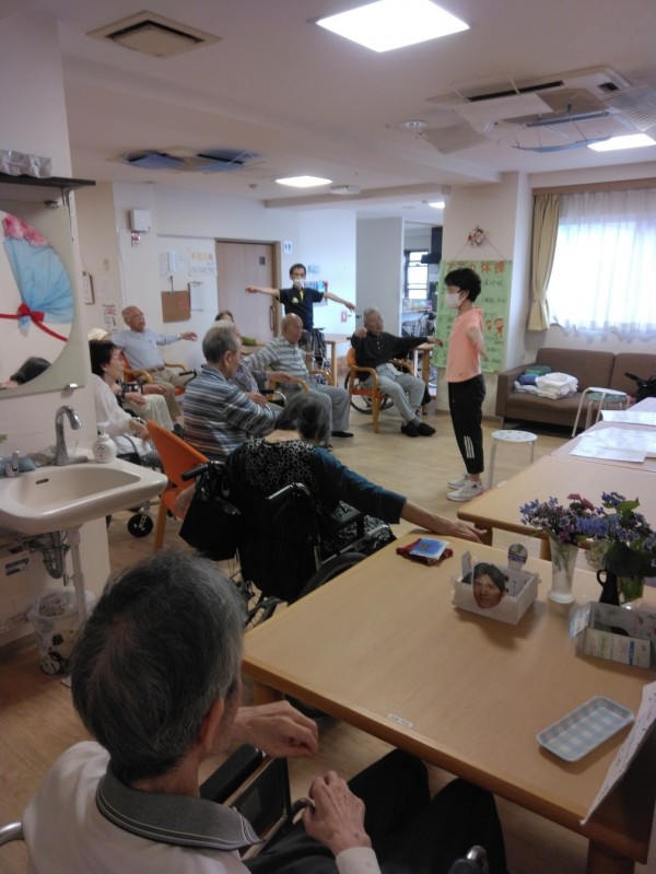 2Fフロアーに沢山のご利用者様が集まり「タオル体操」を