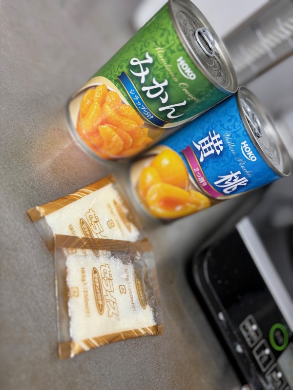 ゼラチンを発見したので今回のおやつはみかんゼリーです(^^♪