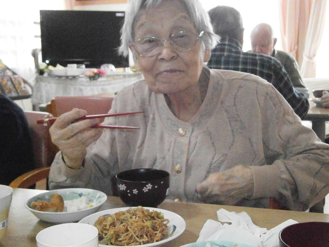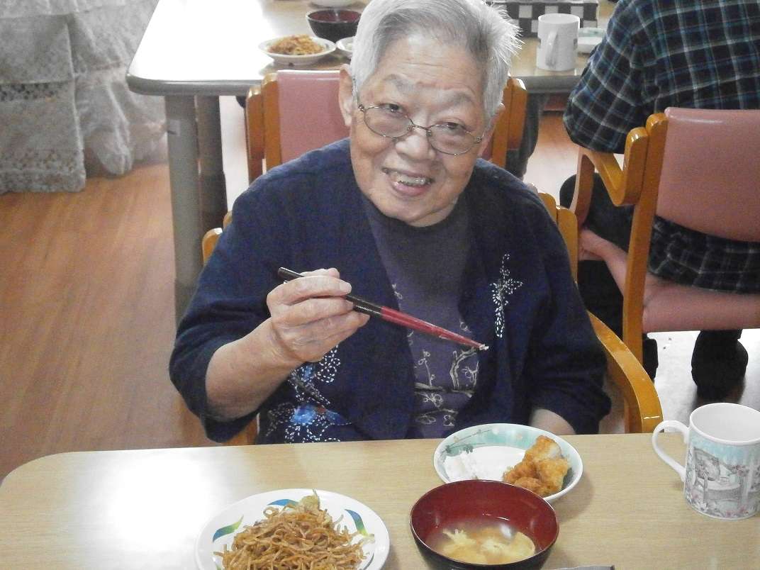 この日のお昼ご飯は焼きそば・中華スープ・から揚げ・ポテトサラダでした。グループホームみんなの家・川崎久地では家族会の日は2フロア、18名の皆様がひとつのフロアに集まり、皆で食事をします。違うフロアの皆様との混合のお席ですので、