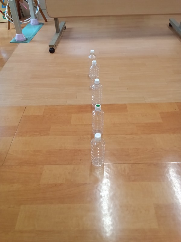ペットボトルを縦に5本並べています。1人2投投げて、全部倒せたらもう1回投げます。