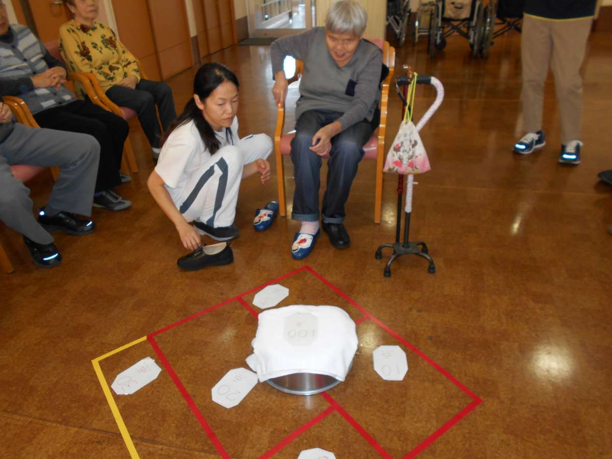 スリッパ飛ばしで得点を競うゲームを行いました。