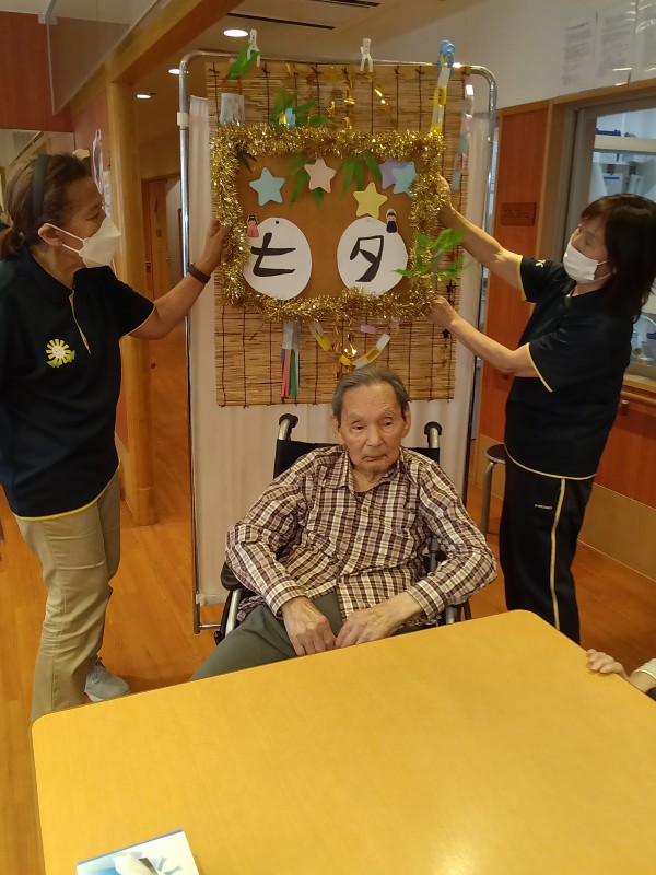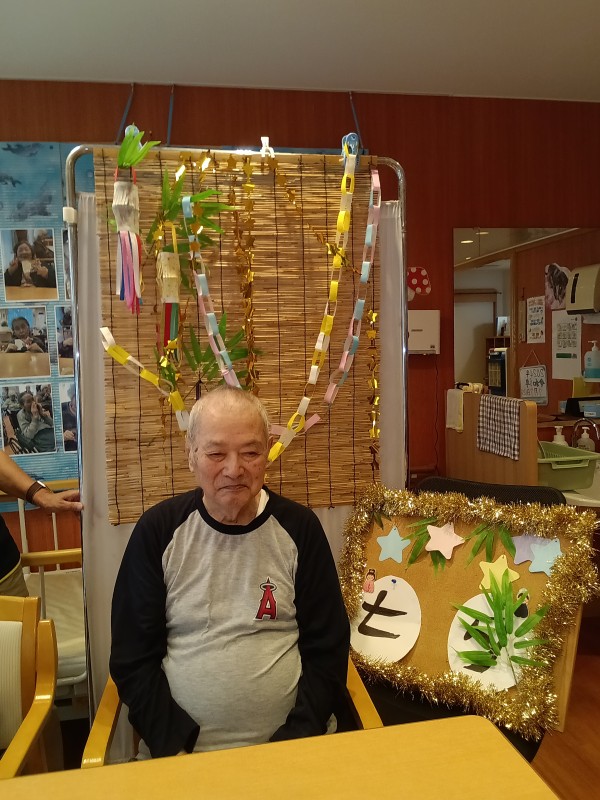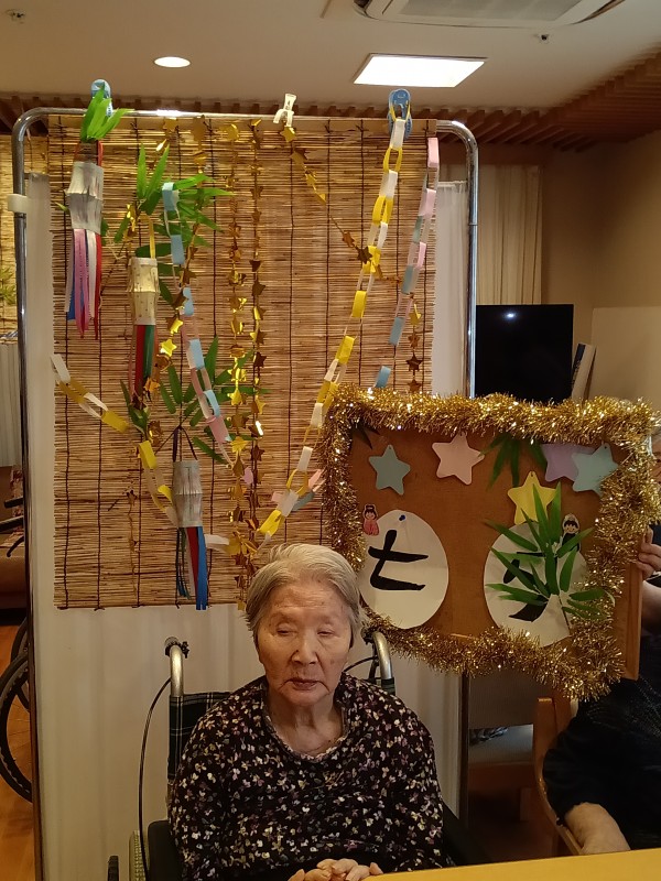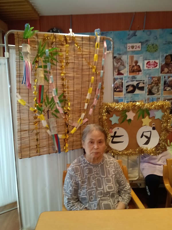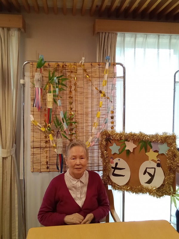 皆様が、作成した七夕の飾りの前で、写真撮影しました(^^♪