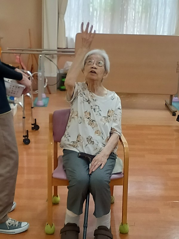 ボンボンを使って、音楽に合わせて体を動かしていきます。