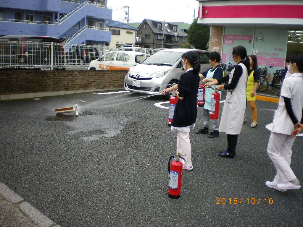 今回は、ご利用者様の避難後に、職員だけで「消火器」を実際に使い、