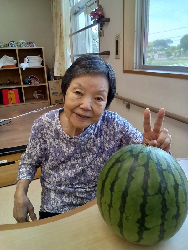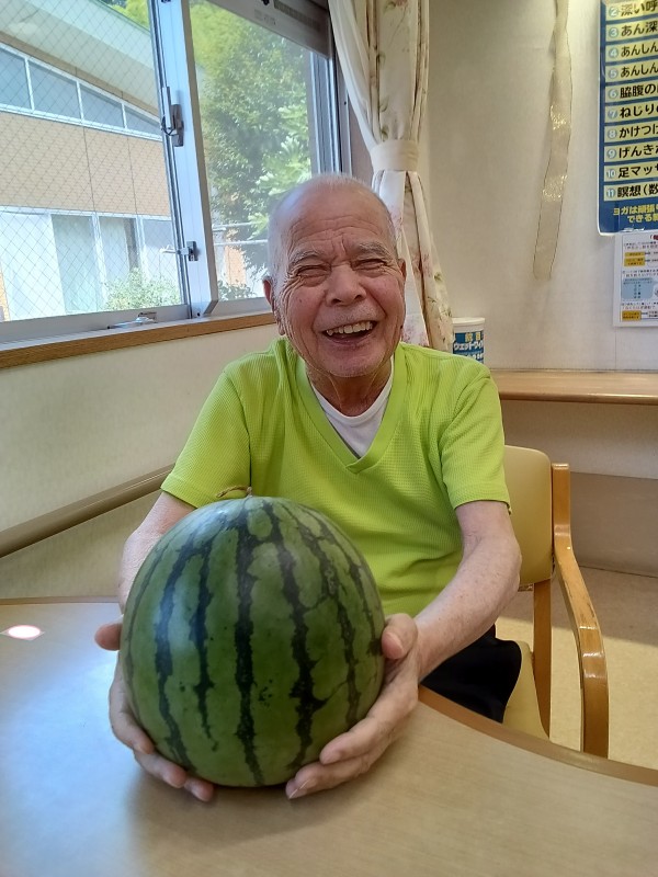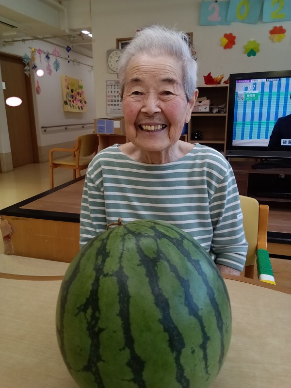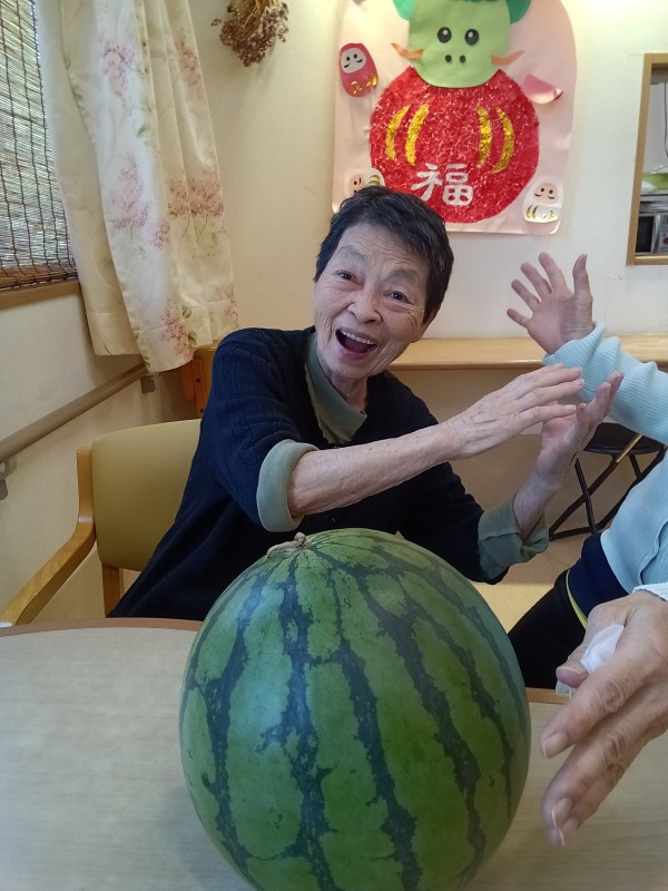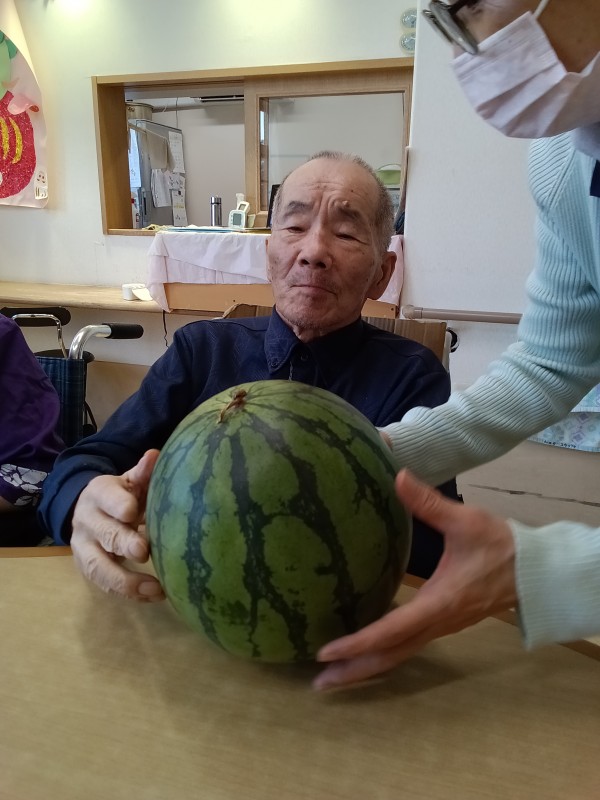 職員からの差し入れで、皆さんのお顔よりかなり大きなスイカ。