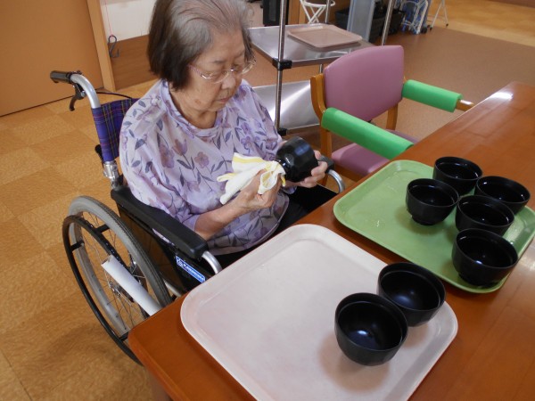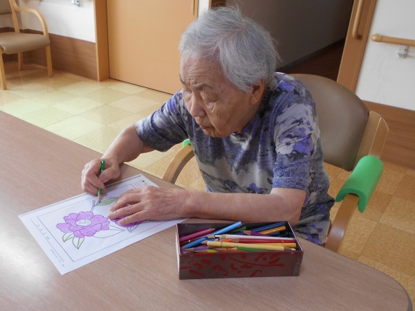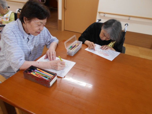 同じテーブルに集まり談笑しながら塗り絵をされたり、家事へ参加されたりなど…(助かっております!)