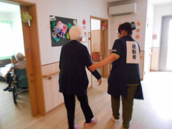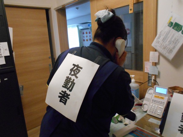 2名の夜勤者役の職員は、普段から夜勤勤務をしている職員ですが、さすが1名で9名の避難誘導は「大変でした」と感想を言っていました。