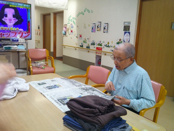 日中はフロアで皆様思い思いに生活されています。洗濯物たたみや新聞折りを手伝って頂くこともあります。