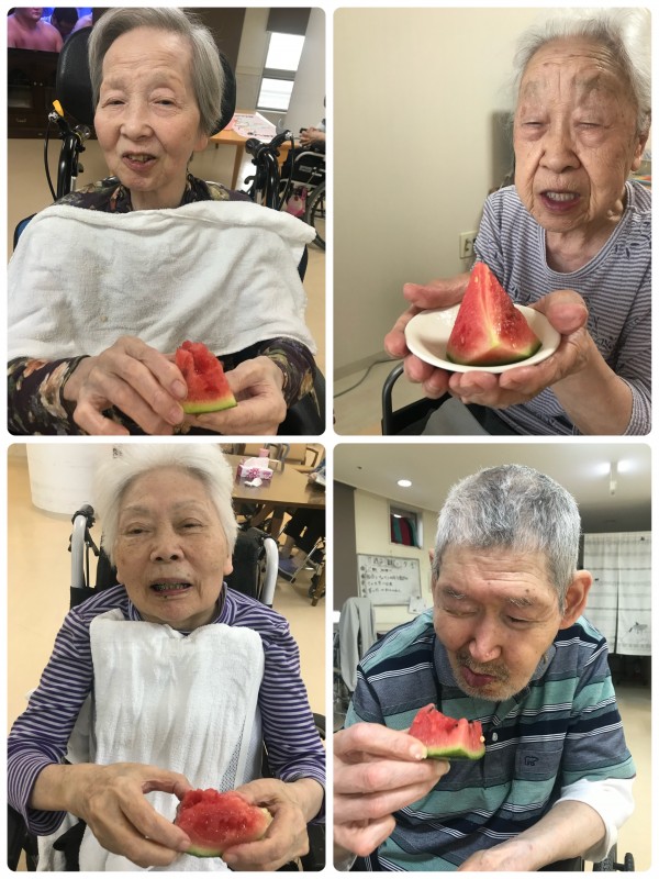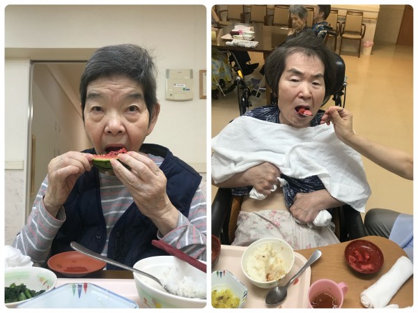 さて、先日スイカが沢山取れたので、夕食と一緒にみなさまにお届けしましたー!!