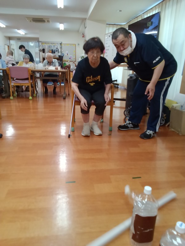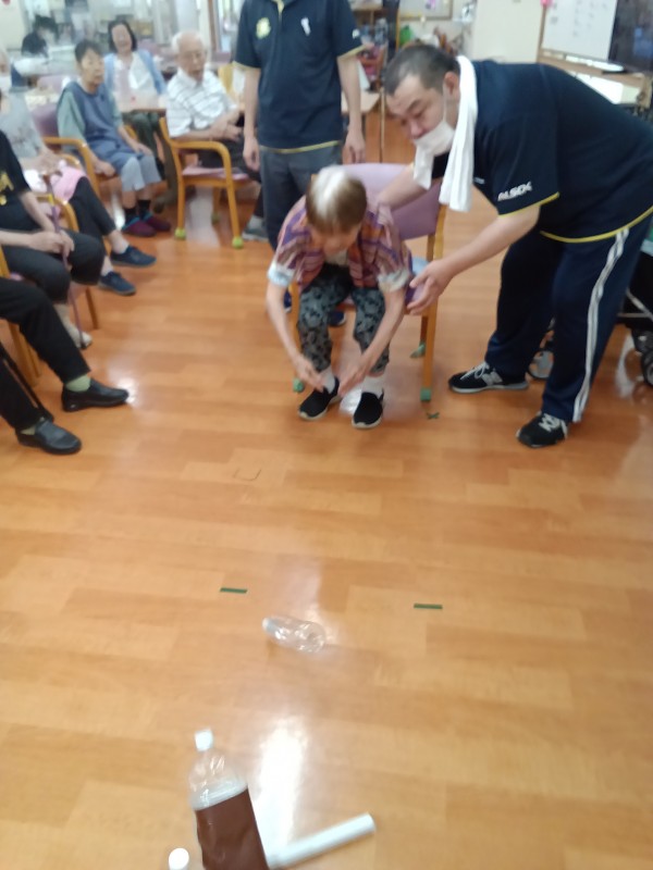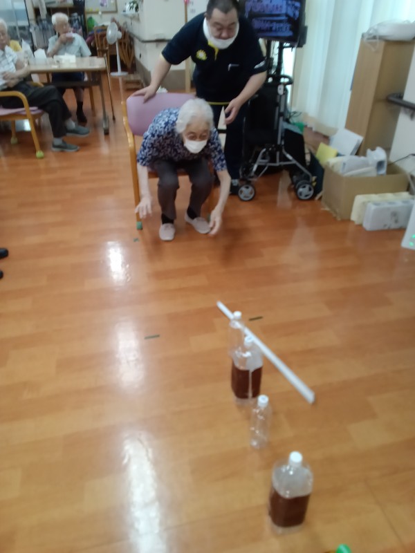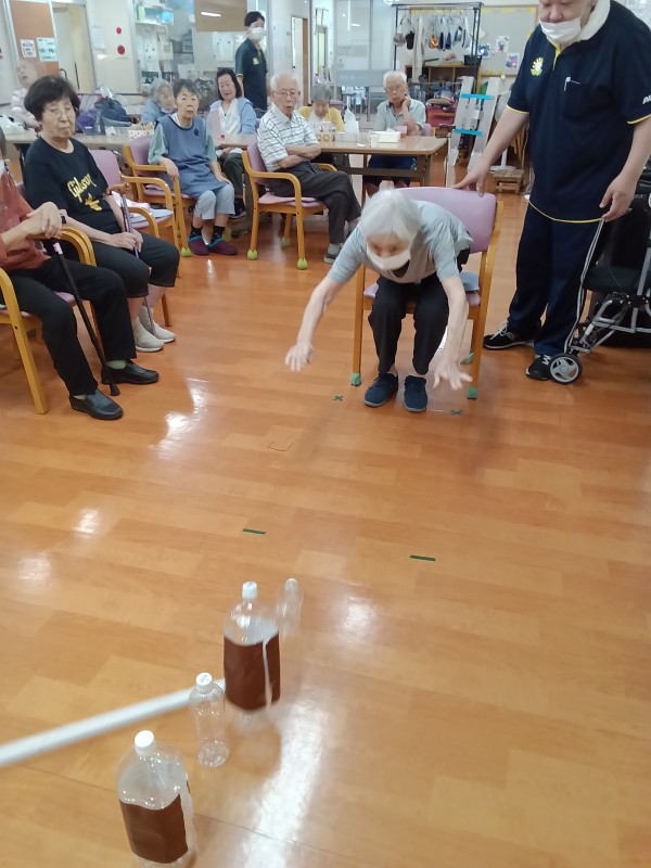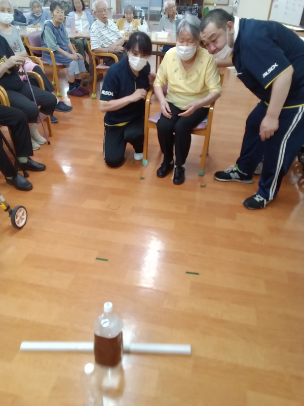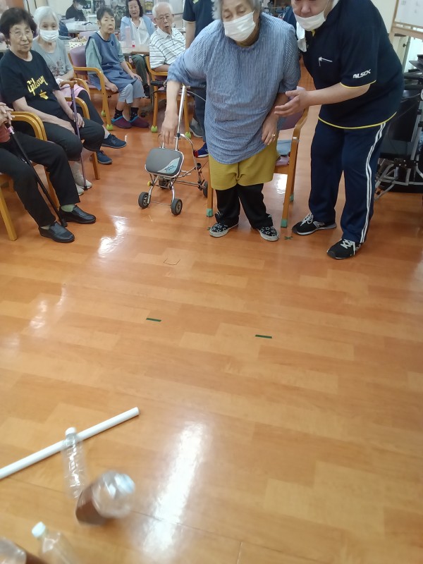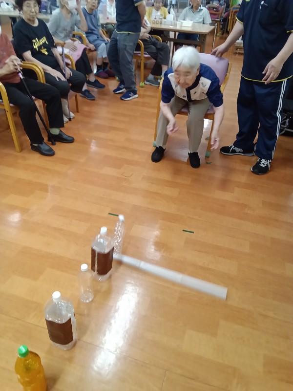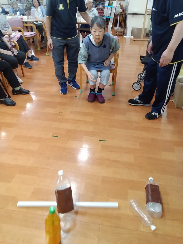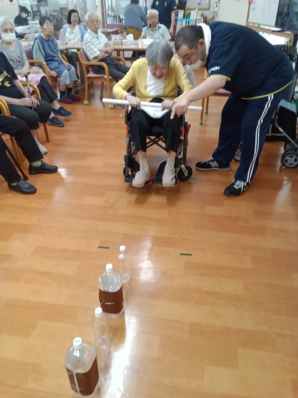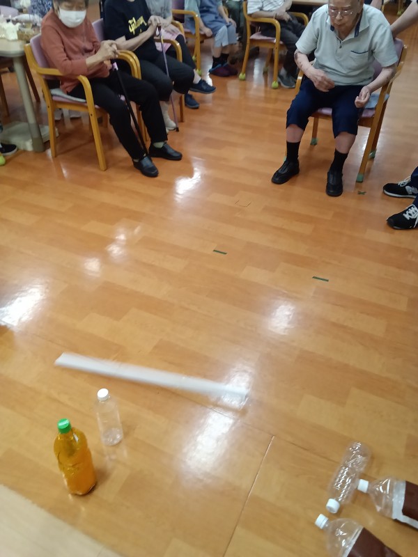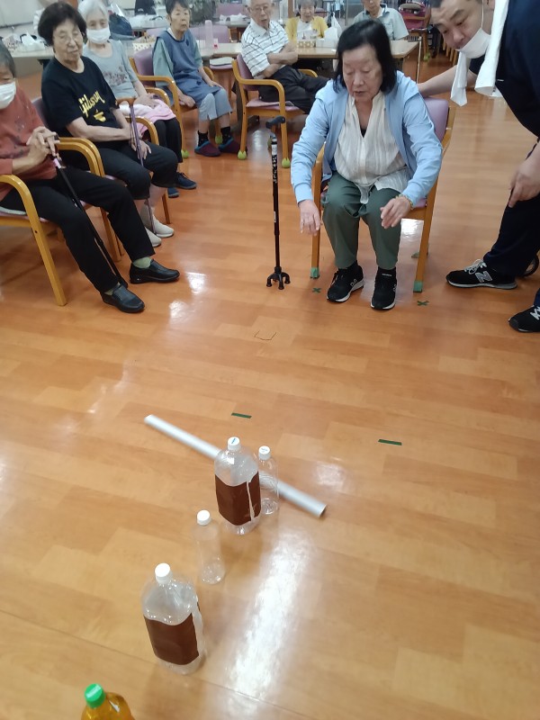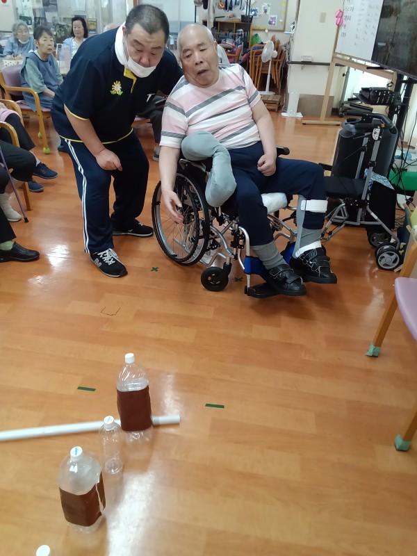 ペットボトルを縦に5本並べて、棒を転がして倒した本数で勝敗決めています。