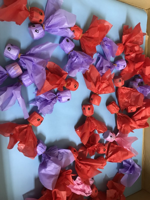 花紙とペットボトルのキャップを使い作りました。