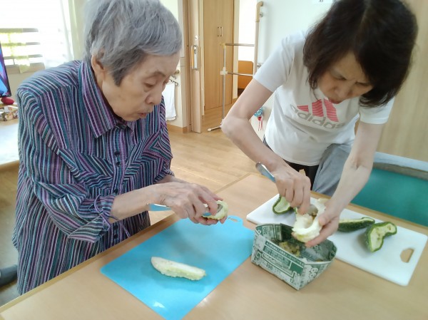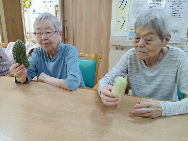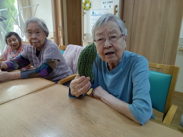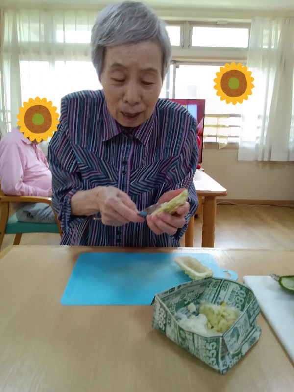 苦いゴーヤをどんな風に召し上がっていただきましょうかと考えながら、ご利用者様に種とワタをとるお手伝いをお願いしました。