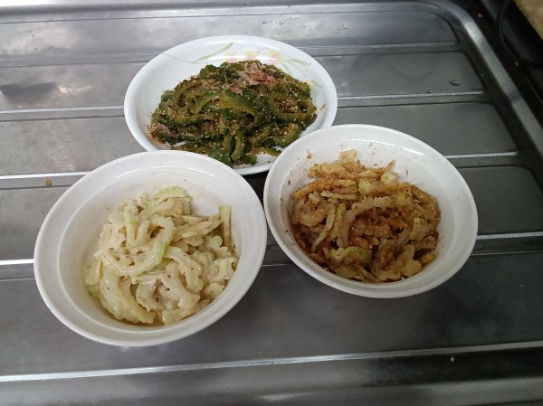 白と緑ゴーヤのおかかとごま和え、白ゴーヤの胡麻ドレッシング味の三品を作りました。