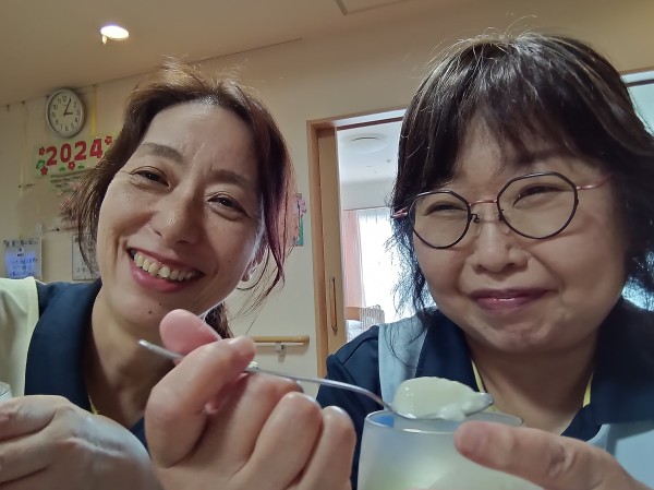 先日のスイーツ担当は〇職員さん(右)お手製の「杏仁豆腐」です!