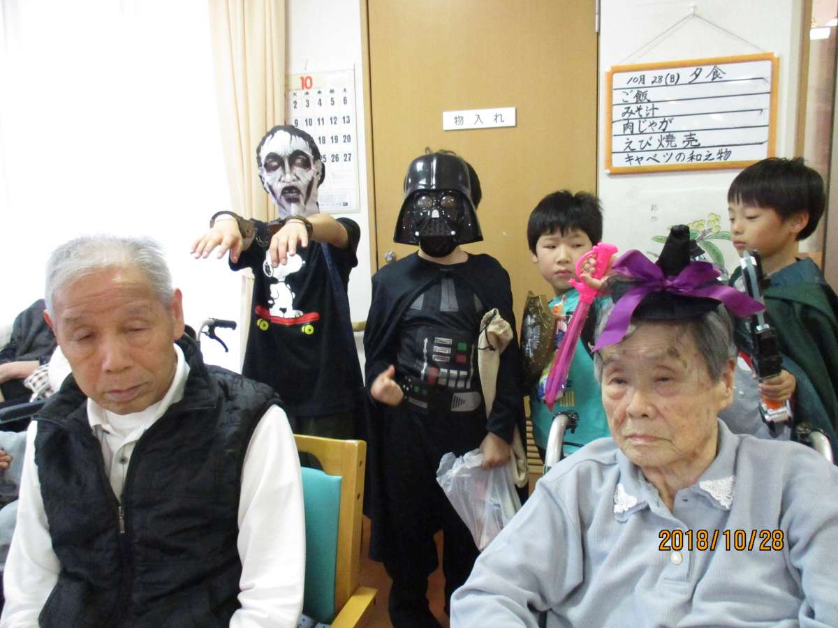 今年は100人以上(130人位)尋ねて下さいました。ご利用者様達もちょっとだけ仮装して子供達と写真をたくさん撮りました。