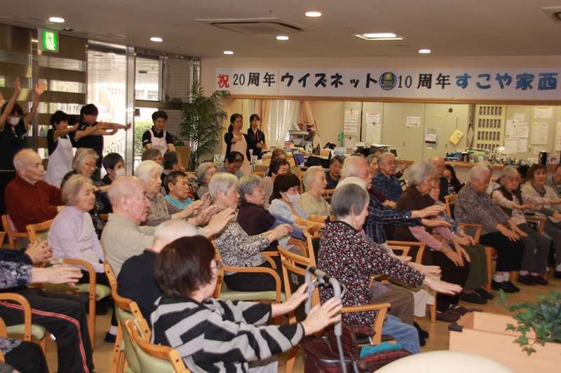 10月23日(火)2か月ぶりの、あんしんヨガ教室いつもは、すこや家西東京の3階・5階のフロアーで行っていますが、今回はデイサービスのご利用者様から、ショートステイ、グループホーム、特定すこや家西東京のご入居者の方々と職員が、1階玄関ホールにて約60名の参加およそ1時間、呼吸を整え先生の教えに従ってヨガの世界に浸っていました。