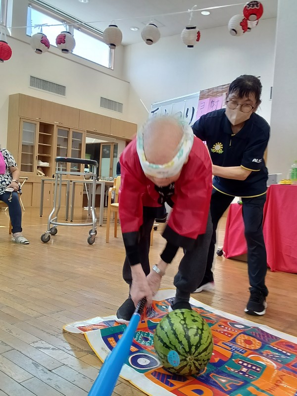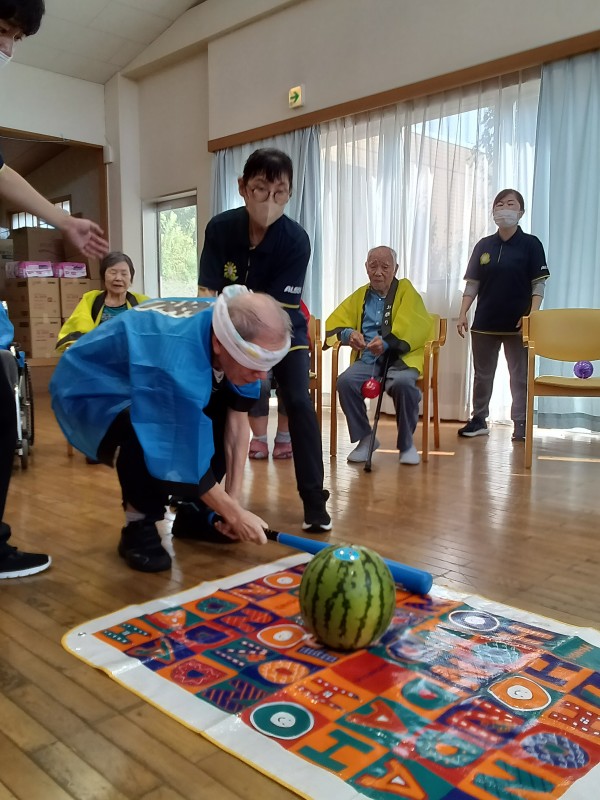皆さん目隠しをし大きなスイカを目掛けて思いっ切り