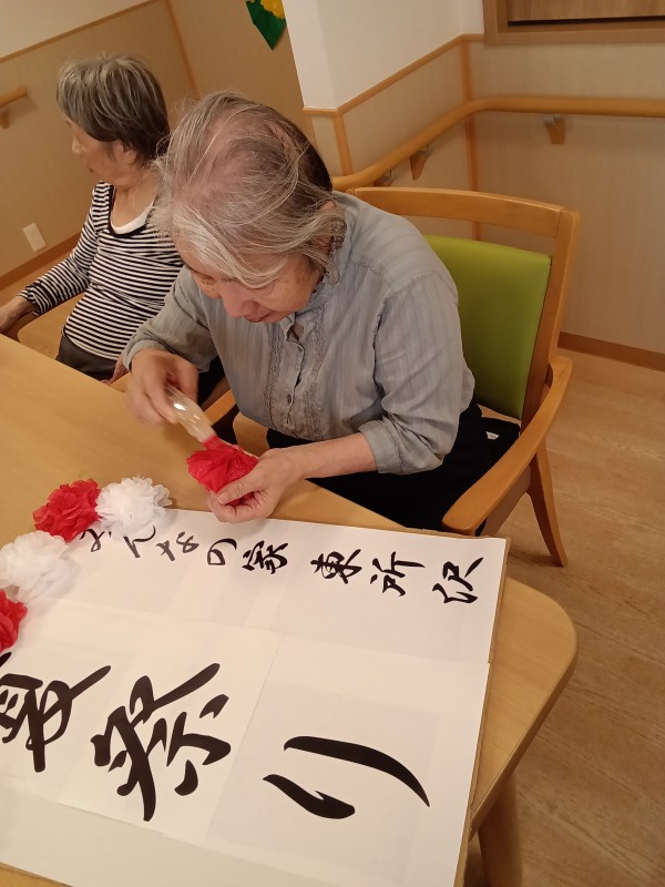 紅白のお花紙を看板に貼ったら完成です!