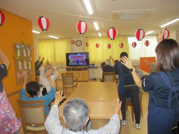 「いきいき盆踊り」が始まると、テレビ画面に釘付けなり、トレーナーの動きに合わせ、盆踊りを堪能されていました。