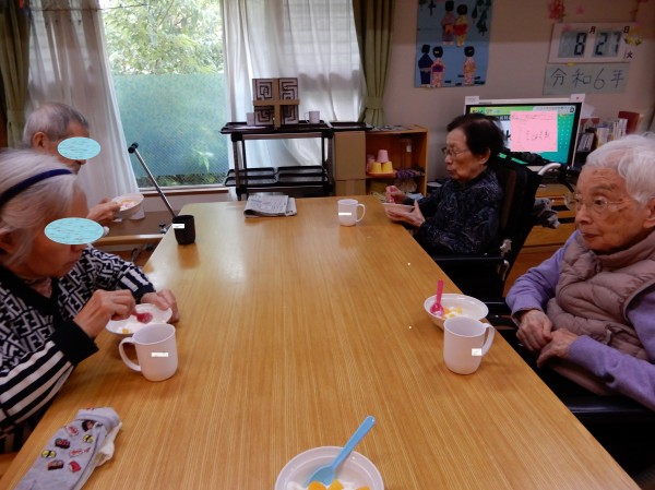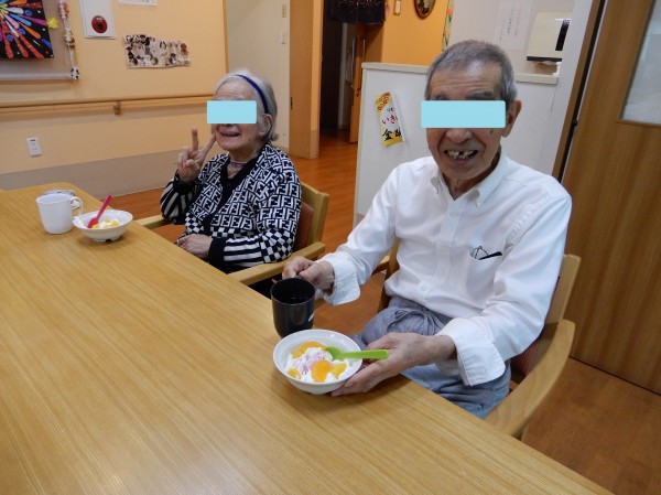 3. 8/27 食レクを行いましました。夏!と言えばアイス‼という事で、2色のアイスクリームにホイップクリーム、果物を乗せました。溶ける前に召し上がれ。ひんやりしていておいしいい、と声が上がりました。