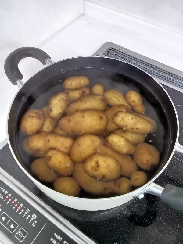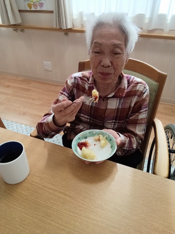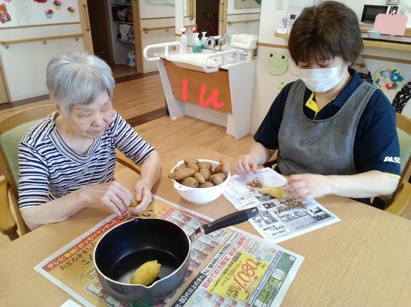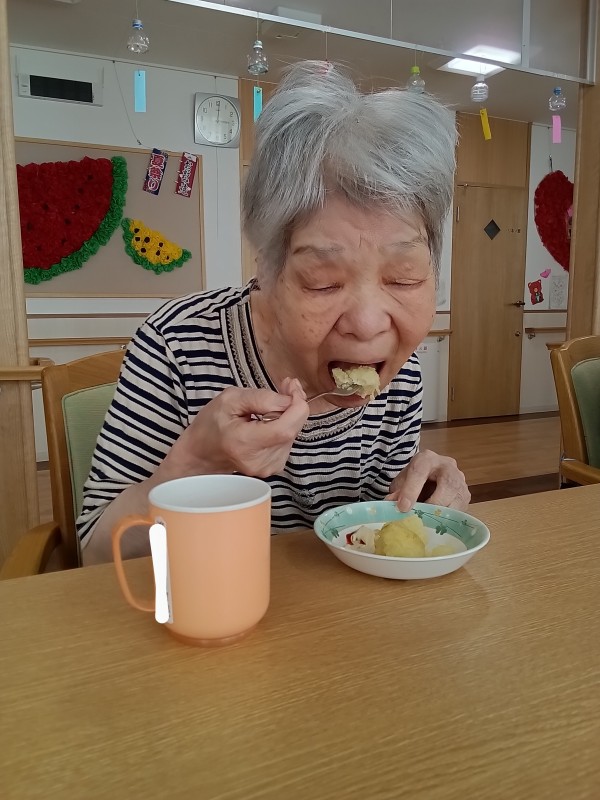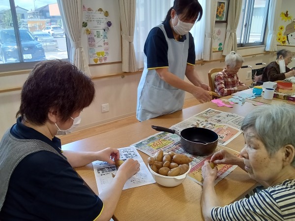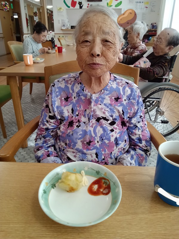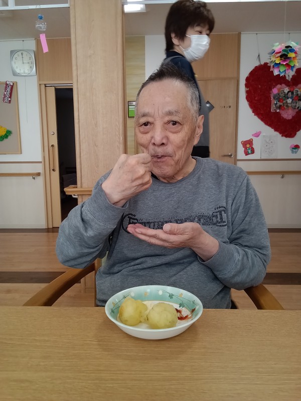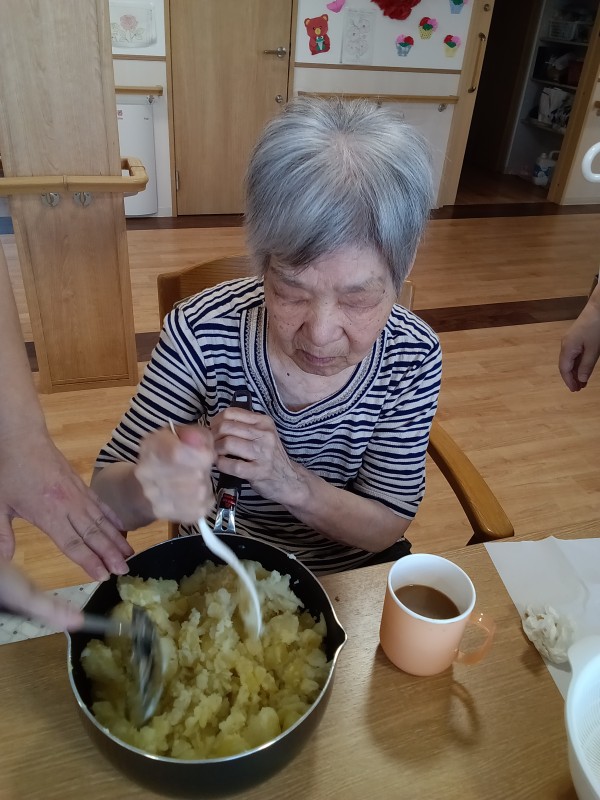 ホームの畑で収穫されたじゃが芋を、茹でてアツアツのうちに皮をむいてつぶして、塩で味付けて油で揚げて皆で美味しく頂きました〜♪