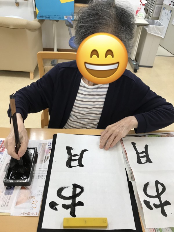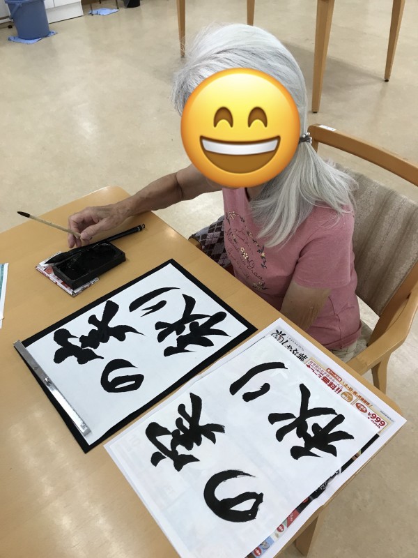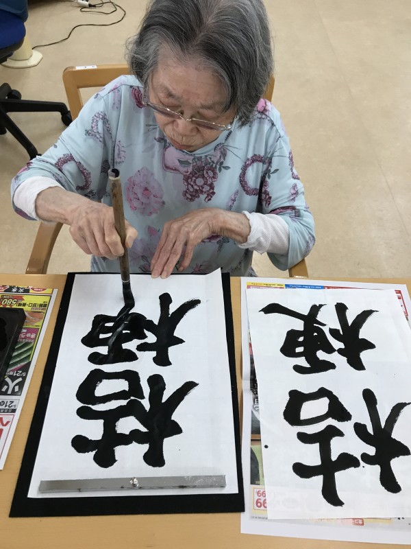 定期的に開催しております書道の時間。月代わりということもありまして新しい文字を書き記しました。