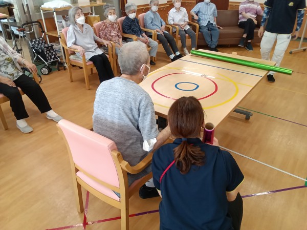 テーブルの上を棒を転がして、どこで止まるかで点数を競うゲームです。