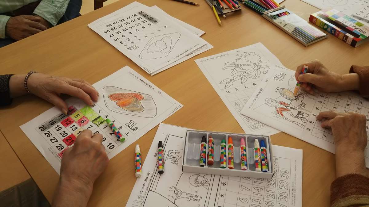 焼き芋の塗り絵を塗り絵を皆で見て、「焼き芋食べたくなっちゃったね」と皆で大笑い。