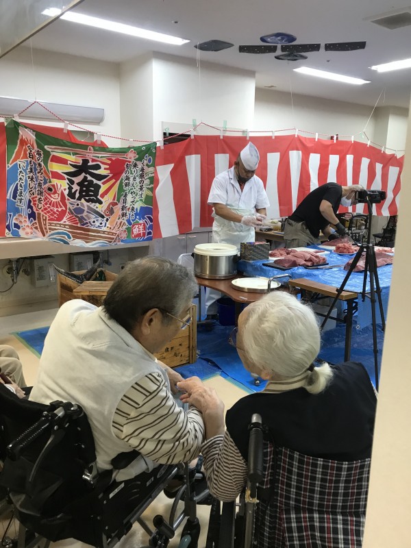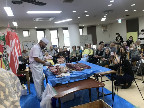 さて、先日は敬老会レク、マグロの解体ショーがありました!