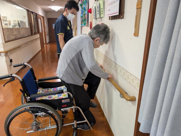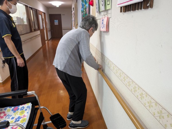 昨年、骨折をしてしまった利用者様・・掴まらずに歩行は困難ですが、掴まり立ち・手すりに掴まっての歩行が出来るまでになりました。