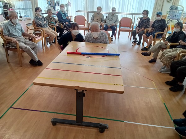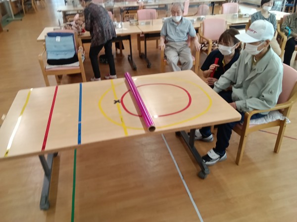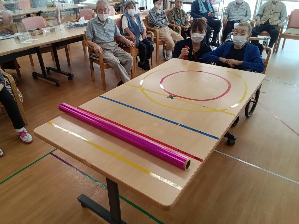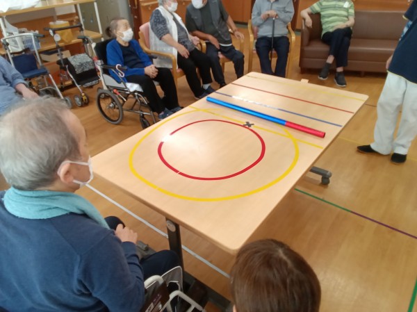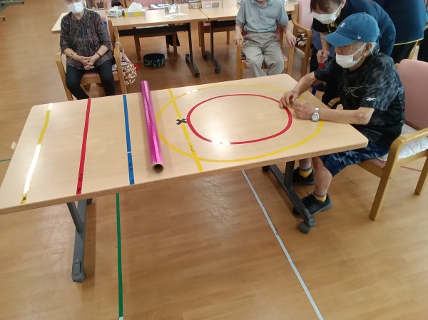 テーブルの上に棒を転がして、止まった場所で点数を得るゲームです。