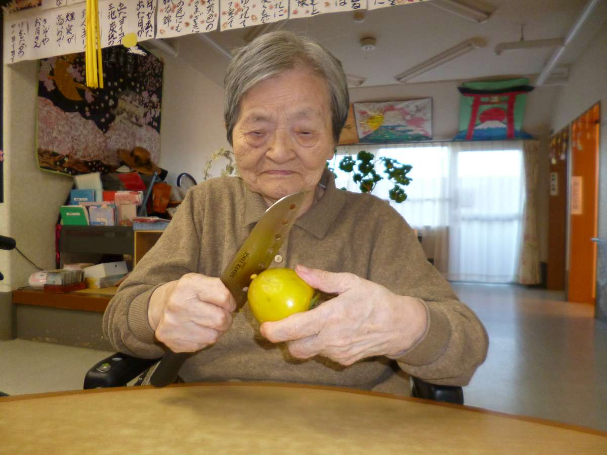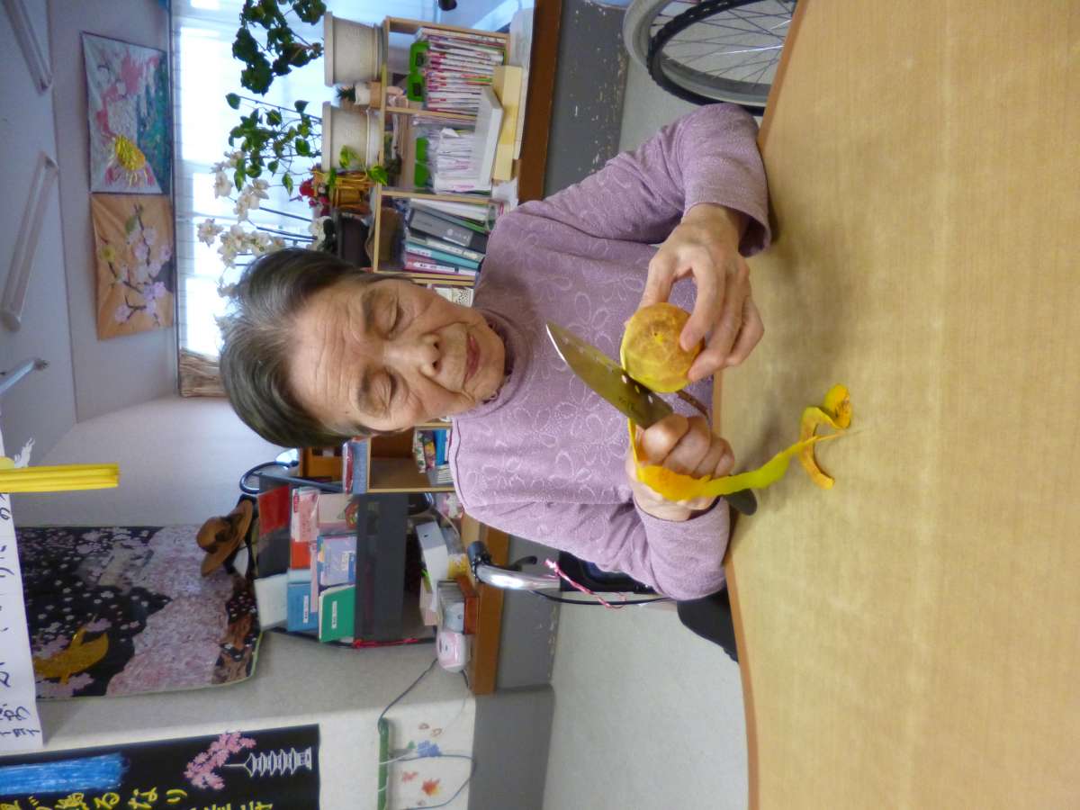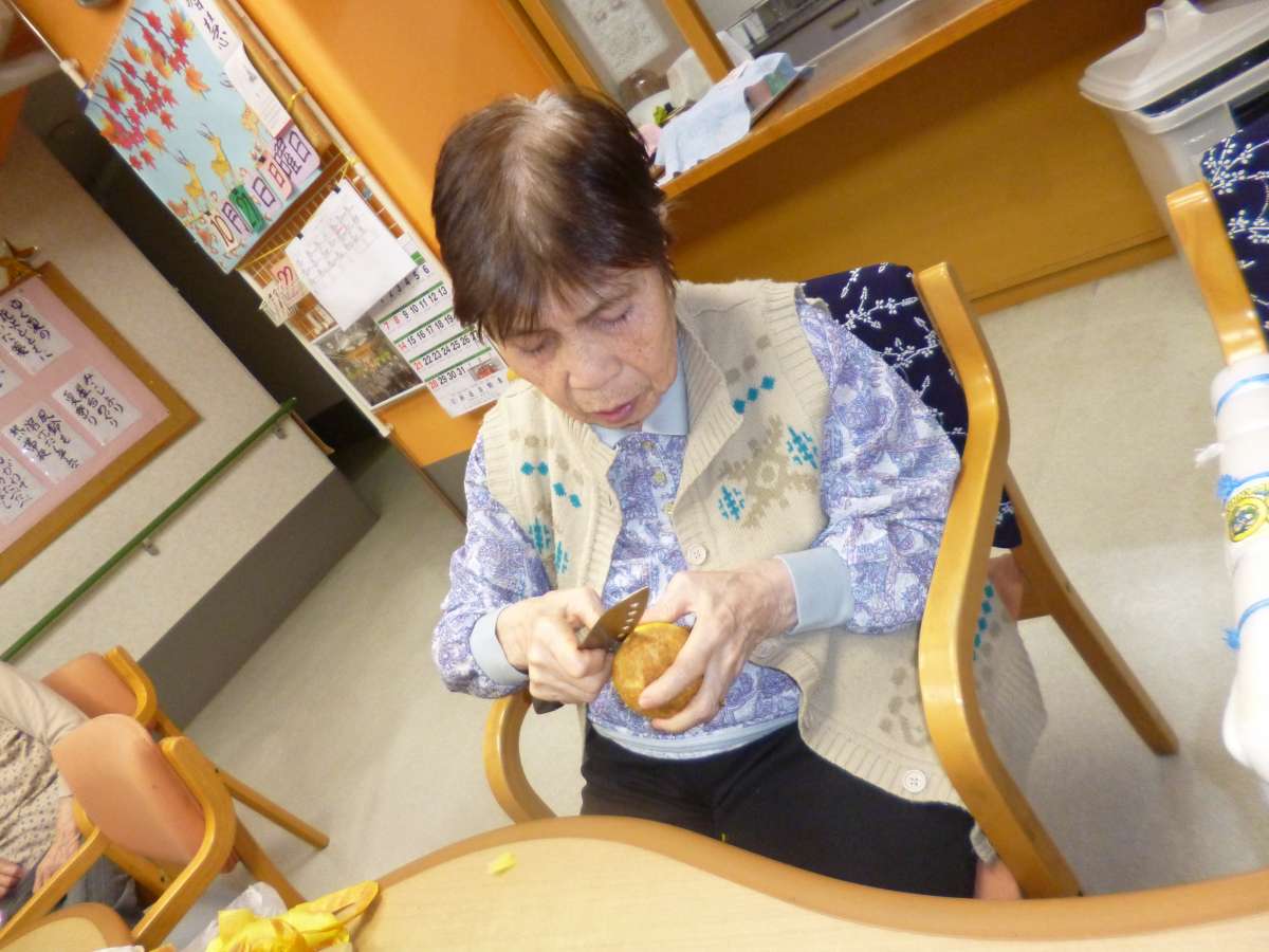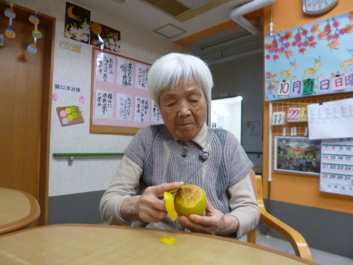 女性陣の入居者様の方々はさすが包丁の扱い方が上手ですね!!次々に柿の皮を剥いていきます。