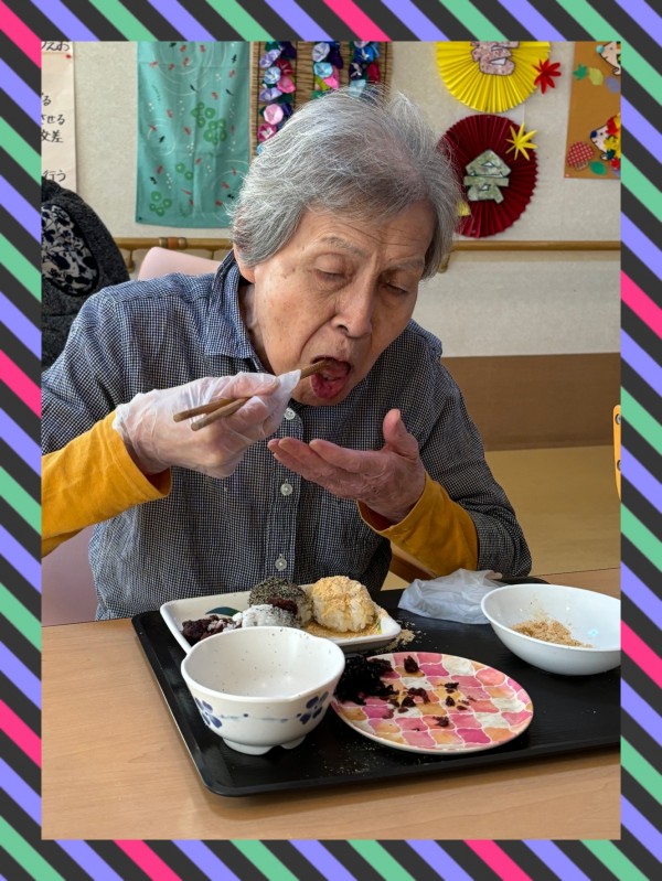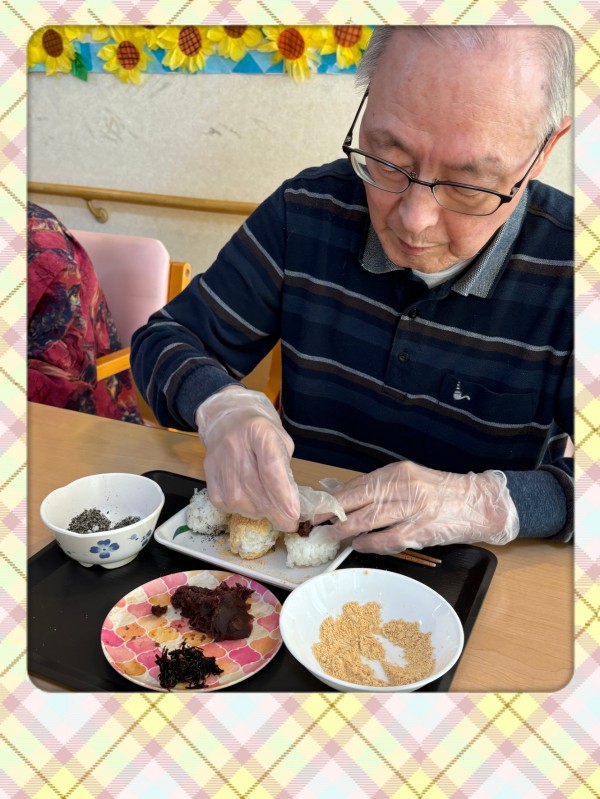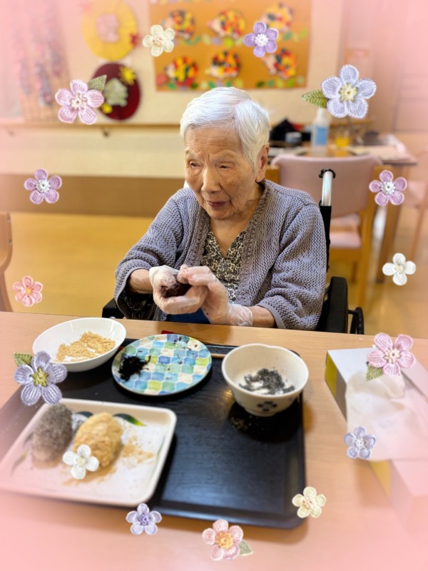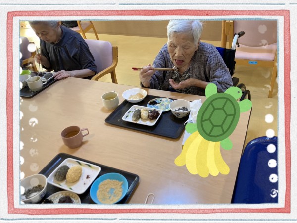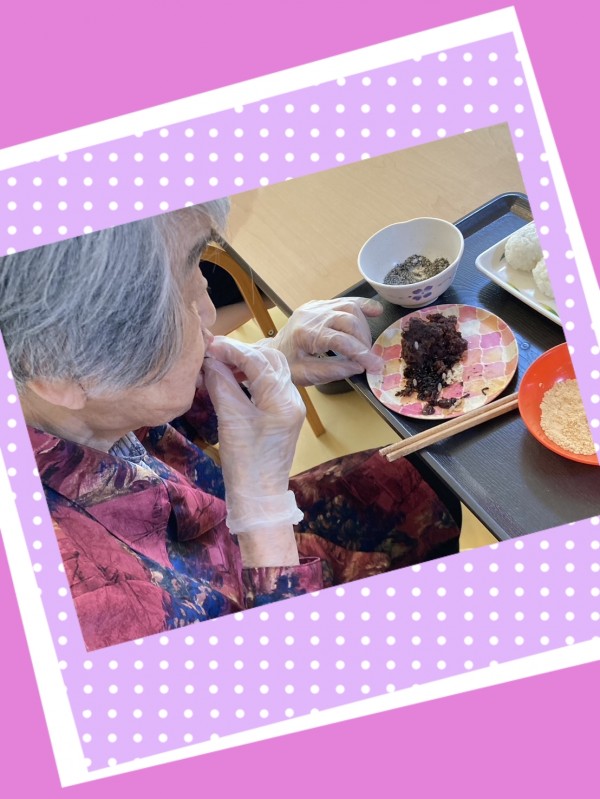 あんこ・きなこ・ごまの三色おはぎをご自身で包んでいただき・・・