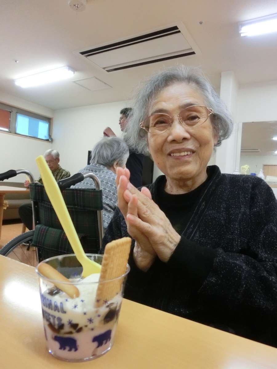 11月のお誕生日会では前回に引き続きおやつレクを開催!!今回、皆様にはパフェをご提供させて頂きました。材料としては下からフルーチェ、コーヒーゼリー、アイスクリーム…なんと3層となっております♪