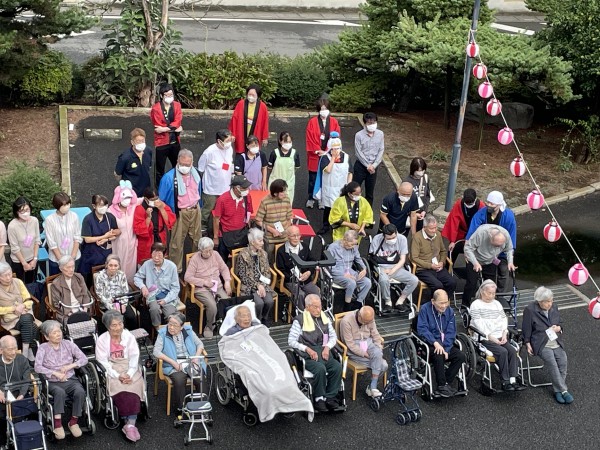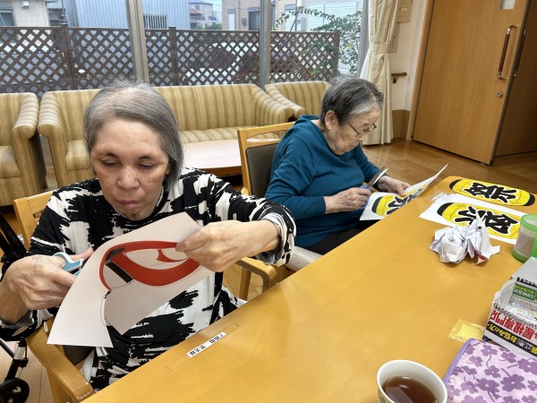 施設内に飾った提灯ですが、職員が空き時間を利用して作っていたのですが間に合わず、1階の入居者様にもお手伝いして頂きました。